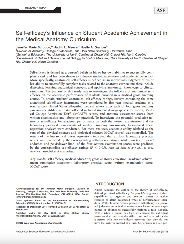 Her current research agenda focuses on two primary areas. First, she continues to advance the use of the Anatomical Self-Efficacy Instrument (ASEI), developed during her graduate training, which measures professional students’ self-efficacy in the gross anatomy curriculum. Anatomical self-efficacy is someone’s beliefs about their abilities to successfully perform a task related to the anatomy curriculum (e.g., learning anatomical terms, dissecting, applying anatomical knowledge), and has been shown to predict performance on written examinations and laboratory practicals (Burgoon et al., 2012). Second, she collaborates with LECOM–Seton Hill faculty and students on PBL research, examining the role of artificial intelligence, particularly large language models, as well as the impact of gamification on student learning outcomes.